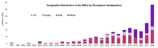 随着ADC赛道的持续火热,已经吸引了众多MNC的目光。2022年,新进临床的ADC产品呈现爆发式增长,几乎是2021年的两倍。其中,大部分产品均由美国和中国的制药公司开发,而在寒冬当中想要顺利推进临床研究,充足的现金储备便显得尤为重要。此外,来自亚洲特别是中国的ADC项目数量已经连续多年超越美国,自然也令国内ADC领域的Biotech们成为重要的种子选手。