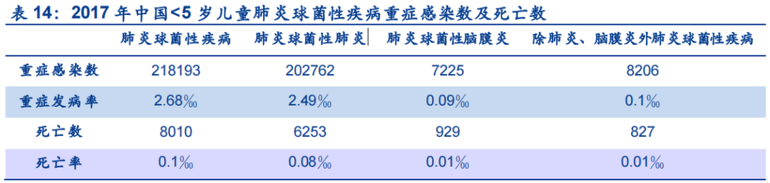 国内儿童同样深受其害,2017年中国5岁以下儿童约有55万感染肺炎球菌性疾病,其中约有22万为重症感染者,比例高达40%,死亡率为0.1‰ 。