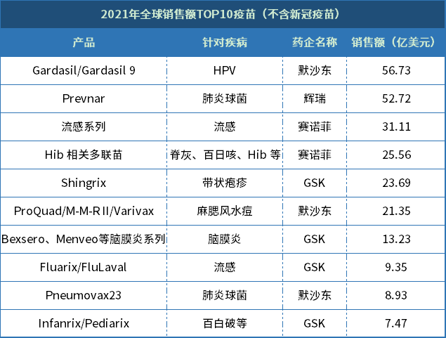 幸运的是,疫苗早已上市,且针对成人和儿童不同的致病菌,及免疫体质的不同,分为肺炎球菌多糖(PPV)疫苗和肺炎球菌结合(PCV)疫苗,一直在全球十大“明星”畅销疫苗之列,而PCV疫苗作为婴幼儿的“守护神”,排名一直靠前,辉瑞的Prevnar2021年销售额为52.73亿美元,仅次于时下最火的HPV高价疫苗。