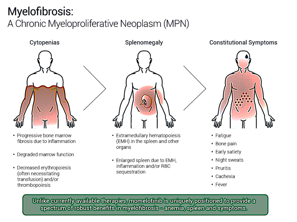 骨髓纤维化患者的骨髓会形成瘢痕组织会并削弱其产生正常血细胞的能力,直接症状为脾脏肿大、疲劳、瘙痒和盗汗等,严重影响患者的生活质量。骨髓纤维化的患者往往症状重、生活质量差、生存期短,约23%的骨髓纤维化患者会转化为急性髓系白血病,患者诊断后平均生存期仅5年。