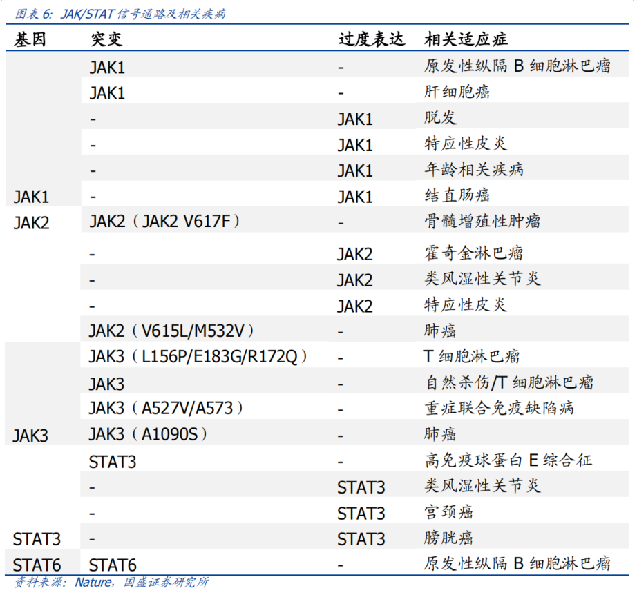 JAK属于非受体蛋白酪氨酸激酶家族,由JAK1、JAK2、JAK3 和TYK2四个亚型组成,存在于人体内各种组织和细胞。(四个亚型靶点功能不同:JAK1对应免疫&炎症&癌症等疾病领域、JAK2对应血液系统相关疾病治疗、JAK3对应自身免疾病治疗;TYK2对应皮肤淋巴增殖性疾病&T细胞白血病)