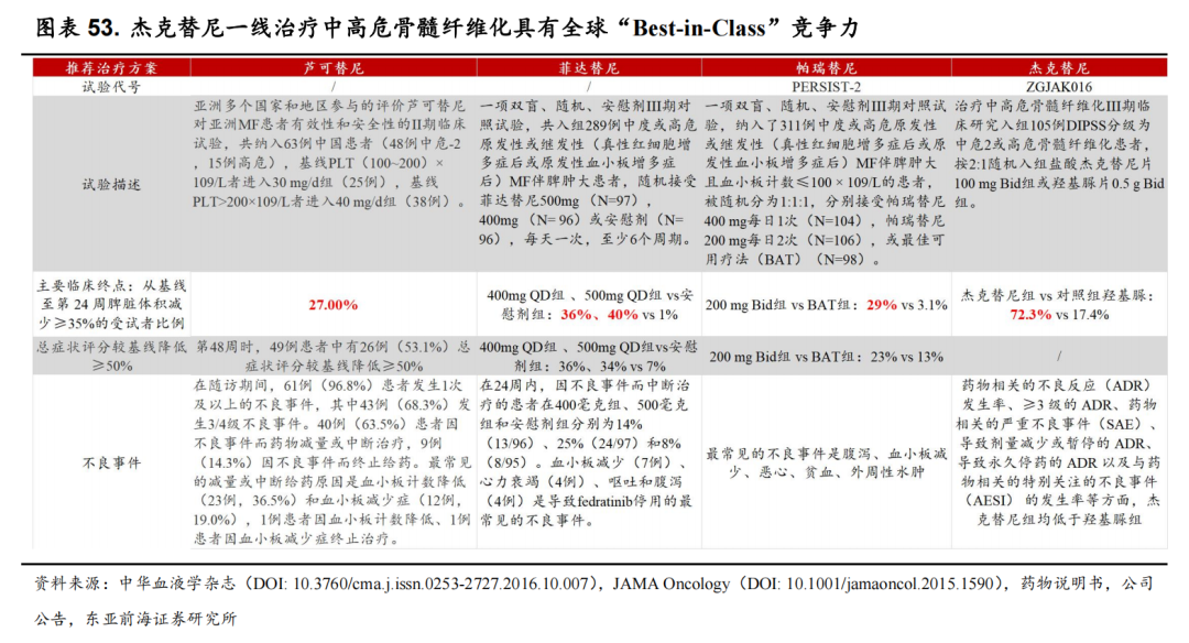 从已有三期数据看,有效性方面杰克替尼的24周脾脏体积降低大于等于35%的患者比例高达72.3%(入组患者数量少于菲达替尼、帕克替尼),但也展现出了优秀的有效性;安全性方面,大于三级不良反应(200mg组)比例分别为贫血(28.8%)、血小板减少(11.5%)、中性粒细胞减少(11.5%),这项数据也显著优于芦可替尼,期待杰克替尼在ASCO上更详细的数据披露。
