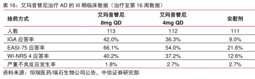 临床数据显示:16周时,艾玛昔替尼8mg、4mg组获得研究者总体评分(IGA)达到0(皮损完全清除)或1(几乎完全清除),且较基线下降≥2分(IGA应答)的受试者比例分别为42%和36.3%,湿疹面积与严重程度指数(EASI)较基线改善至少75%(EASI-75应答)的受试者比例分别为66.1%和54%。