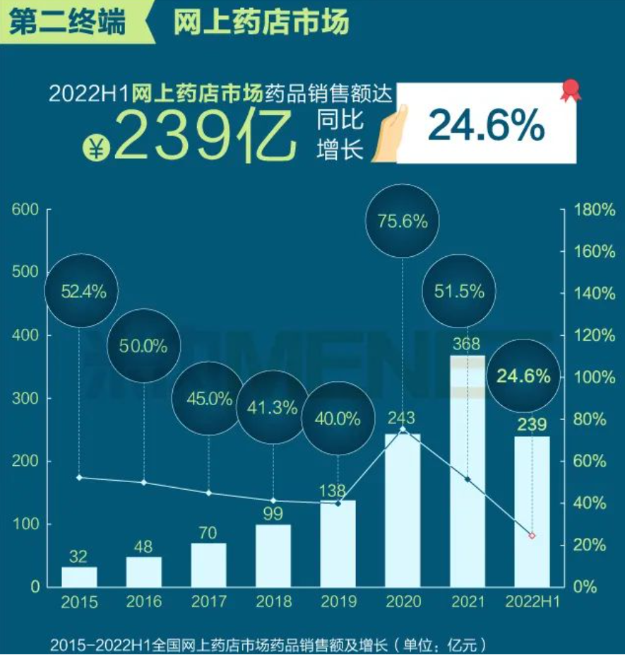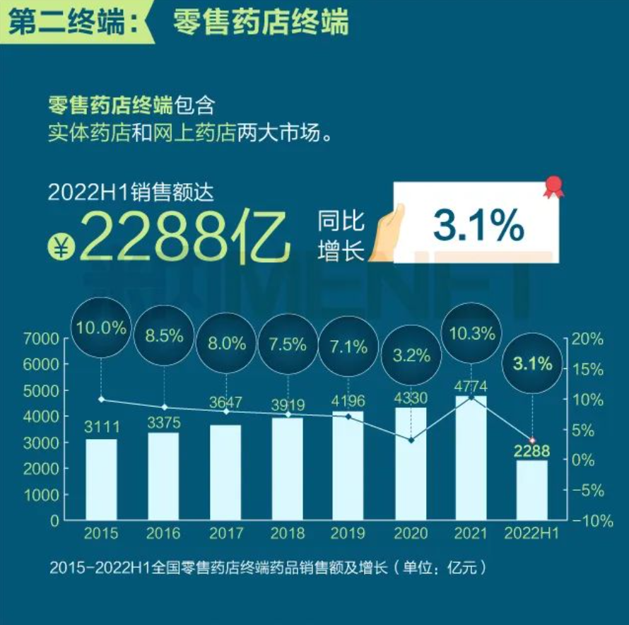 全年零售药店终端销售额达5209亿,同比增长9.1%。其中实体药店销售额4702亿,同比增长6.7%;网上药店销售额507亿,同比增长37.6%。