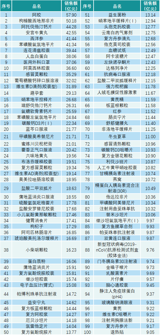 从中康CMH发布的数据来看,2022年销售排行TOP100的药品销售额均超9亿,共计1761亿元,超药品零售市场的三分之一。其中阿胶、枸橼酸西地那非片超50亿元,阿托伐他汀钙片、安宫牛黄丸、西洋参、苯磺酸氨氯地平片超40亿元,连花清瘟胶囊、感冒灵颗粒等超35亿元。