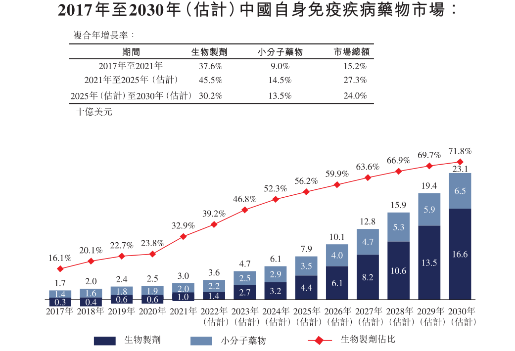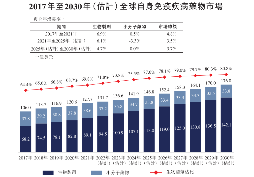 据弗若斯特沙利文报告,全球自身免疫性疾病药物市场估计在2030年将达到1760亿美元。