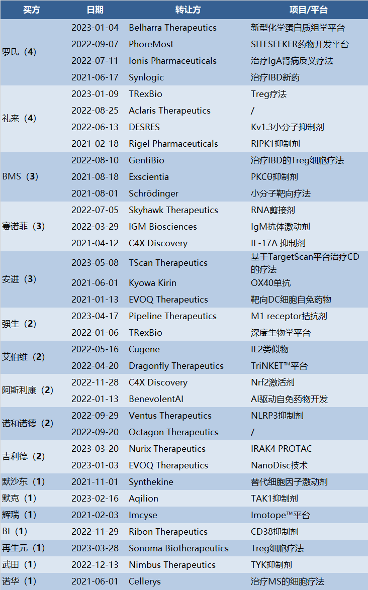 如果说默沙东用超100亿美元获得4款临床阶段产品标志其在自免领域实现“弯道超车”,那么2022年医药领域最大一笔收购案——安进豪掷278亿美元收购Horizon Therapeutics获得自免和炎症领域已上市3款产品则表明其在自免领域的雄心。此外,辉瑞以67亿美元收购Arena,吉利德以4.05亿美元收购MiroBio,勃林格殷格翰收购Trutino Biosciences均表明了跨国药企抢滩自免领域的决心。除此之外,制药巨头在自免领域的交易/合作事件也频频发生,艾伯维、罗氏、强生等已在这一领域占据优势地位的巨头们自然是未雨绸缪,通过与领先的Biotech合作,寻找下一代自免之星。而诺和诺德、默克、再生元等企业也在尝试通过与一些平台型公司合作加入这一赛道。跨国药企近3年免疫性疾病领域合作/授权一览