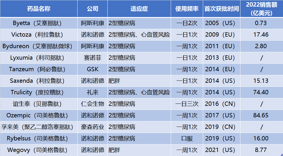 但内源性GLP-1在血浆中的稳定性较差,容易被二肽基肽酶4(DPP-4)快速降解,半衰期不足2分钟,这就直接限制了天然GLP-1的应用场景。GLP-1类似物因此催生,结构经修饰后半衰期得以延长,可稳定调节血糖水平。随后,全球范围内陆续上市9款GLP-1R激动剂,包括每日1~2次的短效皮下注射剂(艾塞那肽、利拉鲁肽等)以及每周1次的长效皮下注射剂(度拉糖肽、司美格鲁肽等)。