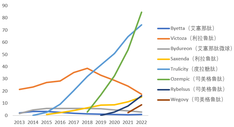 从GLP-1类药物近10年的销售曲线可以看出:1)糖尿病适应症中,受长效剂的冲击,短效剂失去了增长动力,开始黯然落幕;而司美格鲁肽(Ozempic)以及度拉糖肽两款长效制剂增长势头强劲,霸主地位难以撼动;目前口服司美格鲁肽片(Rybelsus)已率先出线,拉开竞争帷幕;2)肥胖适应症中,明确减重功效的利拉鲁肽(Saxenda)抵不过短效的硬伤,2022年增速已被晚五年半上市的同门竞品司美格鲁肽(Wegovy)远远甩开。