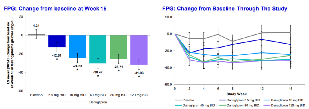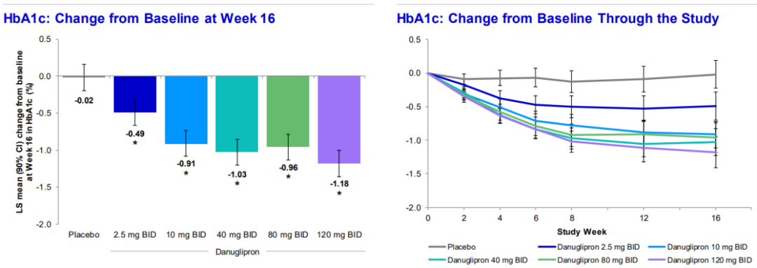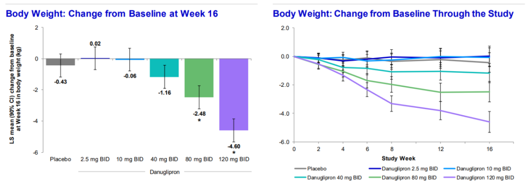 最新公布的临床研究数据足够振奋人心,两款小分子的降糖以及减重效果不相上下。首先来看,分为5个剂量组的IIb期研究:每日口服2次(BID)Danuglipron,为期16周,能明显降低患者的HbA1c水平、空腹血糖(FPG)水平以及体重。其中,最高剂量组(120mg)平均减重4.6kg。