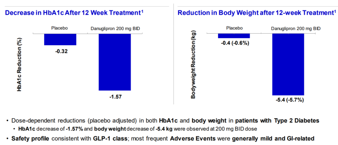 高剂量下降糖、减重效果更佳。IIa期研究数据显示,200mg BID治疗12周后,患者HbA1c降低1.57%,体重减轻约5.4kg。