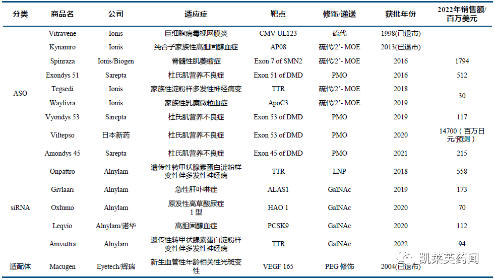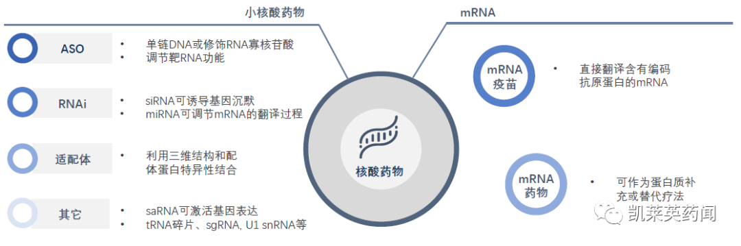 核酸药物可分为小核酸药物和mRNA类药物两类,小核酸药物一般包括十几到几十个碱基对的寡核苷酸序列,广义的小核酸药物既包括RNAi药物(siRNA),也包括反义寡核苷酸(ASO)、微小RNA(miRNA)、小激活RNA(saRNA)以及核酸适配体等。目前上市产品主要集中在siRNA及ASO。