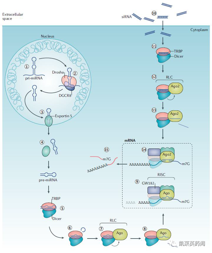 siRNA药物主要通过RNAi机制进行调控,是长双链RNA被剪切为短双链RNA后,与蛋白质结合形成siRNA诱导干扰复合体(RISC),短链RNA的正义链降解后,RISC再与特定mRNA结合使之降解,沉默相应基因的表达。