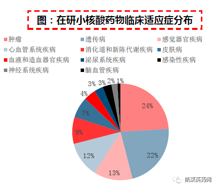 从全球临床适应症来看,随着小核酸药物研发热情上涨,覆盖靶点增加,在研适应症也趋向多样。目前肿瘤已成为小核酸药物临床管线占比最多的适应症,达24%,其余还有遗传病(22%)、感觉器官疾病(13%)、心血管系统疾病(12%)等。