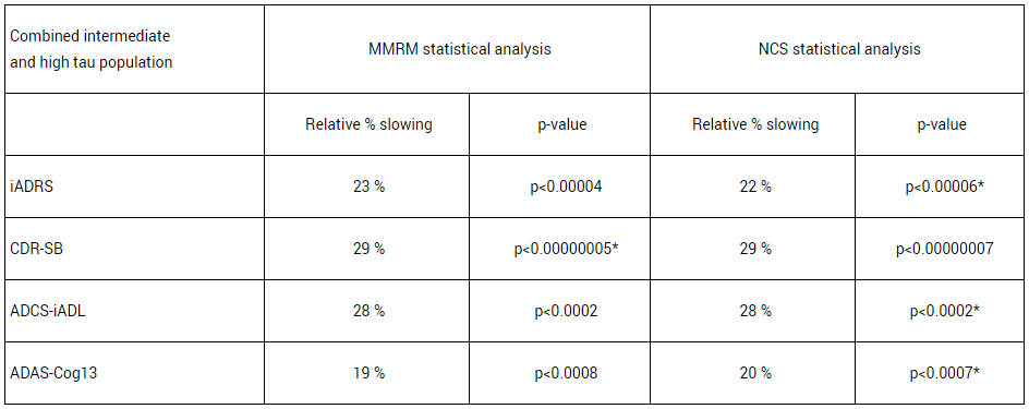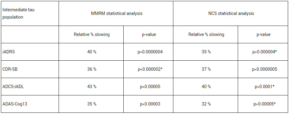这项试验会根据受试者的脑蛋白tau水平(tau是阿尔茨海默病进展的预测生物标志物)进行分层,该研究的主要分析人群(n=1182)由tau水平中等并有明显AD临床症状的患者组成。在该人群中,主要终点AD综合评定量表(iADRS,评估患者的认知能力和生活自理能力)评分显示下降达到35%,重要的关键次要终点基线至18个月的临床痴呆评定量表(CDR-SB,评估患者的认知能力)评分显示下降达到36%;AD协作研究日常生活能力量表(ADCS-iADL)评分显示下降延缓40%;AD认知量表(ADAS-Cog13)评分的变化显示下降达到32%。