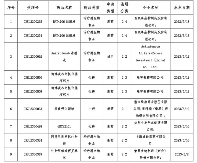 这些受理号分别来自7家企业,7种药品。其中,百奥泰生物制药股份有限公司的BAT4706注射液;瀚晖制药有限公司的海博麦布阿托伐他汀钙片均有2个申请被受理。