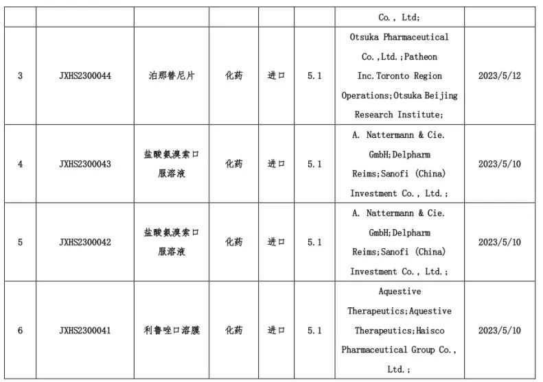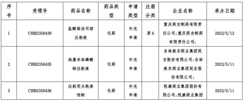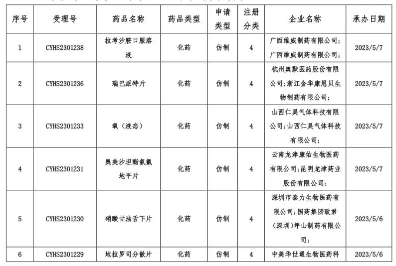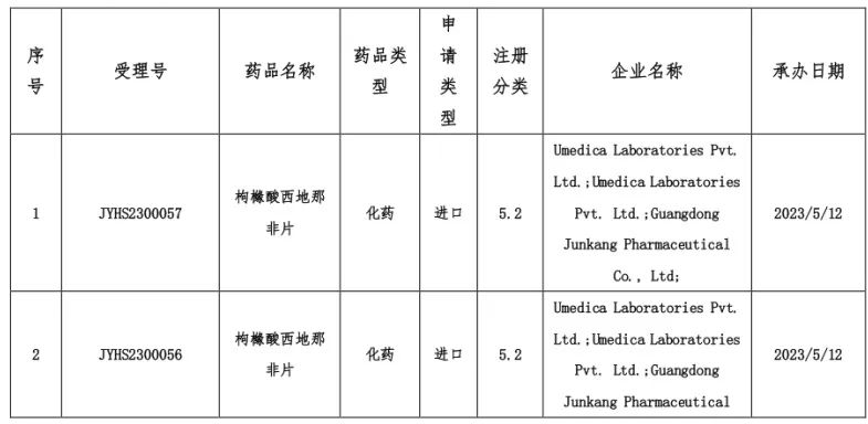 这些受理号分别来自4家企业,4种药品。其中,Umedica Laboratories Pvt. Ltd.、Umedica Laboratories Pvt. Ltd.、Guangdong Junkang Pharmaceutical Co., Ltd的枸橼酸西地那非片;A. Nattermann & Cie. GmbH、Delpharm Reims、Sanofi (China) Investment Co., Ltd.的盐酸氨溴索口服溶液均有2个申请被受理。