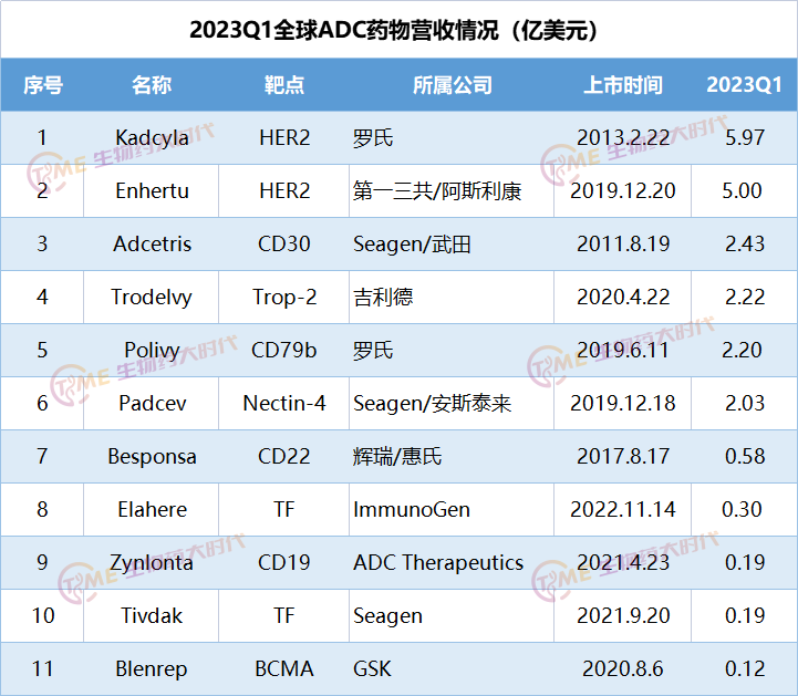 2020年1月21日,该药成功在中国获批,成为我国首个上市的抗体药物偶联物(ADC)。2023年Q1 Kadcyla全球销售额为5.97亿美元,同比增长5%,依然位居全球ADC类药物销售额榜首。