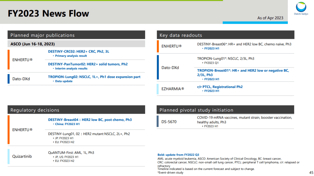 目前,Enhertu已在全球40多个国家获批多种适应症,包括乳腺癌、胃癌和肺癌等。2023年该产品将有3项关键临床试验结果公布。
