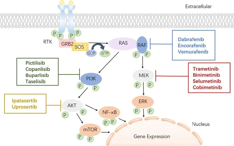 MEK是MAPK通路的一部分,该通路在肿瘤中常常被激活,同时在许多不同实体瘤中升高,包括携带RAS突变的肿瘤。研究表明,RAS—RAF—MEK—ERK信号通路是重要的细胞内信号传递通路,该通路形成上下游信号传递通路,存在于大多数细胞中。正常生理条件下,该通路参与细胞运动、凋亡、分化及生长等;但当该通路上基因发生突变而活化时,该通路会被异常持续激活,导致细胞增殖不受限,而形成肿瘤细胞,各癌种中常见的KRAS、BRAF的突变就基于该通路。