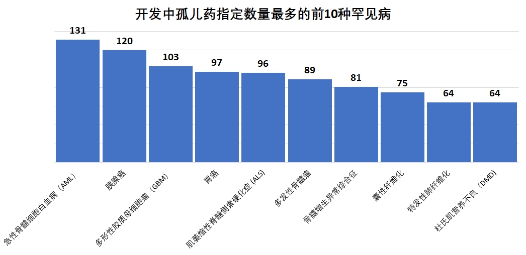 目前有131项针对急性髓细胞白血病(AML)的孤儿药物治疗方案,AML是一种罕见的血液癌症,2019年美国约有70000名受影响患者。此外,以下三种罕见疾病也是孤儿药物最多的癌症类型:胰腺癌、多形性胶质母细胞瘤(GBM)和胃癌。