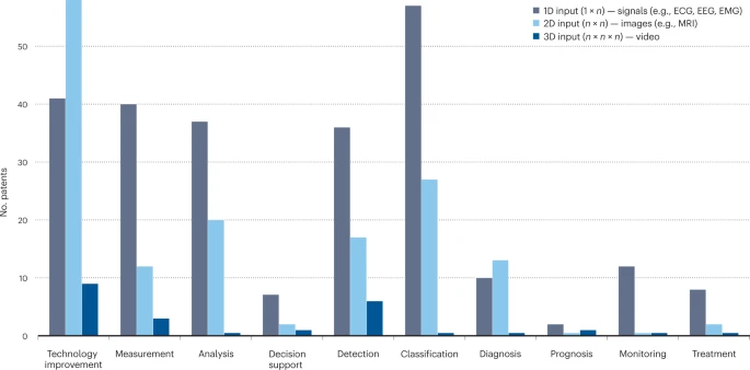 根据使用的输入信号,授权的 MML 专利也不同。一维 (1D) 输入(即1×n矢量)包括ECG、EEG、EMG和 SpO2 数据等健康数据和生理信号;二维 (2D) 输入(n×n矩阵)包括 MRI 或超声检查的图像以及眼睛、皮肤和组织的图像;三维输入 (3D) 需要对专利中声称的 AI/ML 系统进行视频输入。授予 MML 专利 (S7) 的最广泛的独立声明是针对59%病例的 1D 健康数据、生理信号和时间序列数据,而图像占病例的36%,视频占病例的5%。这种分布特别值得注意,因为有更多的 1D 信号/时间序列和从这些 1D 信号运行的医疗器械——41%专注于图像或视频的 MML 专利(36%在图像上)相对于该基线非常高。