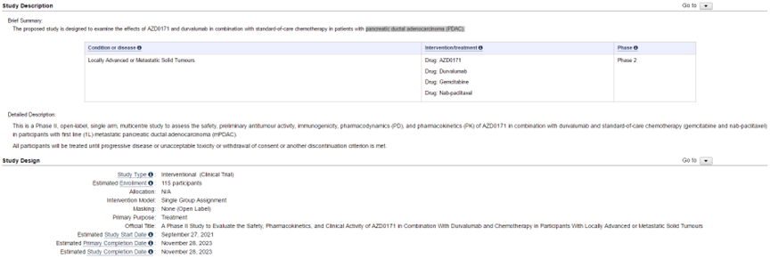 在发现了LIF在胰腺癌胞间通信中的关键作用后,2020年1月,由加拿大Northern Biologics生物医药企业研发的首个anti-LIF抗体 (MSC-1) 获批胰腺癌临床I期试验。2021年8月,全球领先制药公司阿斯利康收购了MSC-1并展开AZD0171(MSC-1)联合抗PD-L1单抗度伐利尤单抗和化疗(吉西他滨和白蛋白结合型紫杉醇)一线治疗胰腺导管腺癌(PDAC)的II期临床试验。目前,全球尚无用于PDAC的免疫疗法获批。该项研究为开放标签,单臂,多中心II期研究,计划招募115例受试者,预计将于2023年11月结束。