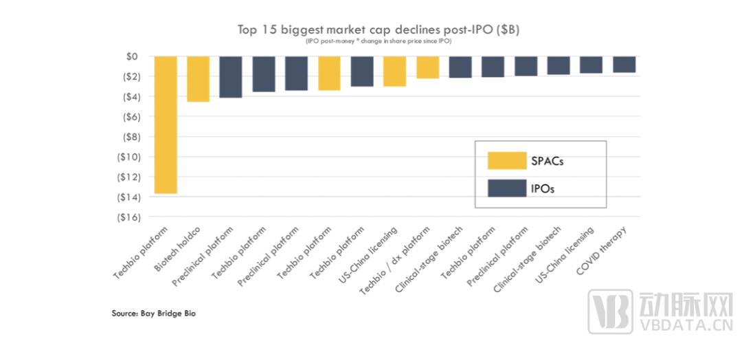 SPACs 和 科技生物(techbio)平台公司一直是表现最差的公司: 按市值计算,10个最大的输家中有5个是 SPACs;10个中有5个是techbio公司。尽管 SPAC 和 techbio IPO 仅占生物技术公开市场IPO的一小部分;SPAC 占新上市公司总数的5% ,但在表现最差的10只股票中占到了50% ;同样,techbio公司占生物制药公开市场总进入量的5% ,却占市值表现最差的10只股票的50% 。