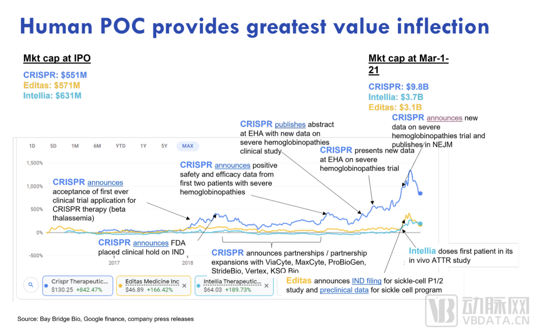 我们可以看看最初的临床前平台biotech IPO的案例 —— CRISPR 的先驱 Intellia,Editas 和 CRISPR Therapeutics这三家公司,以进一步证明临床进展和价值创造之间的联系。