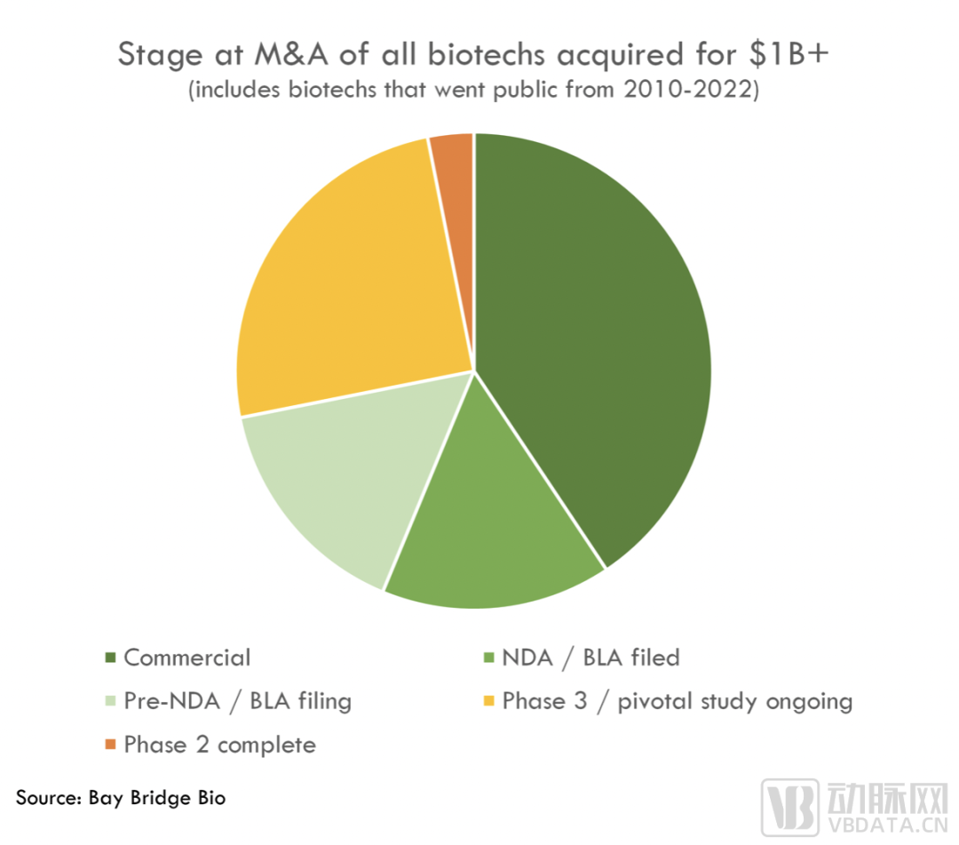 在2010-2022年间上市的500多家生物技术初创企业中,有32家以超过10亿美元的价格被收购。所有这些公司都有降低风险的产品——40% 已经有产品获得批准,31% 已经提交或即将提交监管文件以获得批准,25% 正在进行关键性研究。