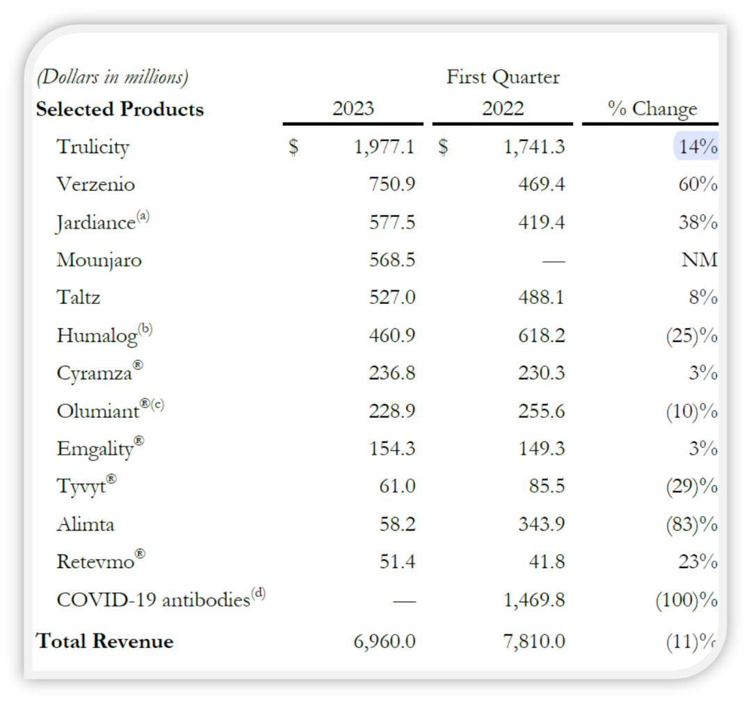 图片:礼来2023年Q1产品业绩 来源:官网,机宝整理