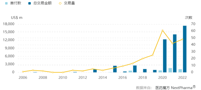 随着国内研发&临床能力上了一个台阶,中国反哺全球的情况也屡见不鲜,License out也成了老生常谈的话题。但一个有趣的点在于,国内对外授权的数量和总合作额在提高,但首付款却在降低。