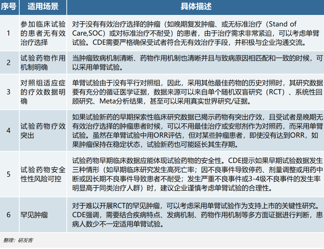 在《指导原则》中,CDE列举了能适用于单臂临床试验的六种条件: