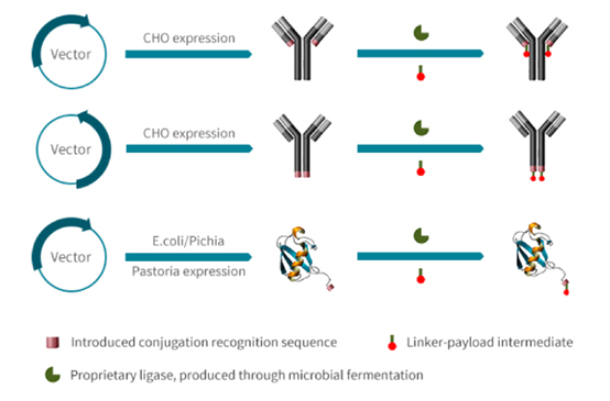 启德医药2013年创立于苏州生物医药产业园,其创始人在公司未注册之前便已开始布局ADC偶联技术,以差异性的酶催化技术开发新型抗体偶联药物。启德医药率先将Sortase 酶应用于ADC偶联技术,建立了LDC (Ligase Dependent Conjugation) 技术平台。LDC不同于其他利用酶催化来进行抗体的糖基化修饰或去修饰、还原或插入偶联位点(如引入叠氮基)等策略,而是直接使用酶催化将Linker和毒素链接到抗体。