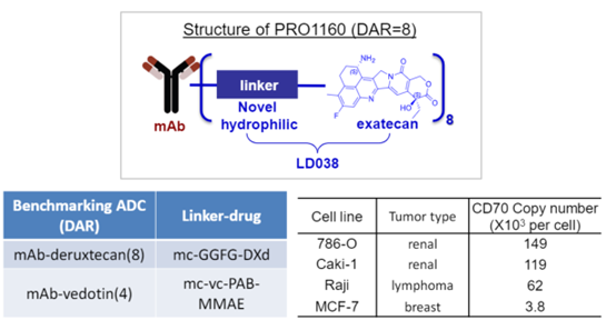 PRO1184分子示意图(来源:AACR2022)PRO1160是一种靶向CD70的ADC,同样采取普方的新型亲水性接头与exatecan组合而成,具有成为宽治疗窗口的同类最佳ADC疗法潜力。临床前研究显示,CD70在多种肿瘤细胞表面高表达,不仅可使肿瘤细胞逃避免疫监视、诱导免疫细胞凋亡,同时也可以激活部分免疫细胞杀伤肿瘤细胞。