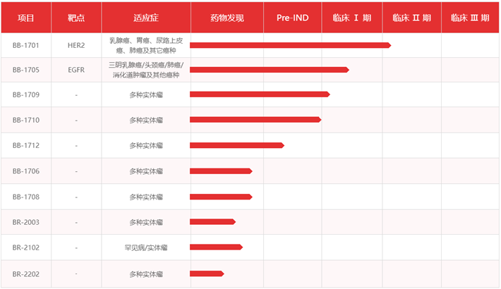 百力司康生物医药(杭州)有限公司创立于2017年12月,是一家专注于抗肿瘤生物创新药的研发和产业化的生物医药企业。百力司康建立了具有完整技术链的生物创新药临床前研究平台,包括先导抗体的设计和筛选、定点偶联抗体的基因工程设计及改造、以及小分子payload及连接子的设计和筛选。百力司康的ADC技术平台特色同样在于定点偶联技术,其管线中已有10款在研产品,其中3款ADC(BB-1701、BB-1705、BB-1709)已进入临床阶段。