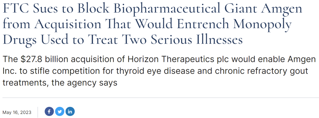 2023年5月16日,美国联邦贸易委员会(FTC)宣布已经提起诉讼,阻止安进以278亿美元收购Horizon Therapeutics,称这一并购将阻碍Tepezza两款新药Tepezza、Krystexxa的市场竞争。