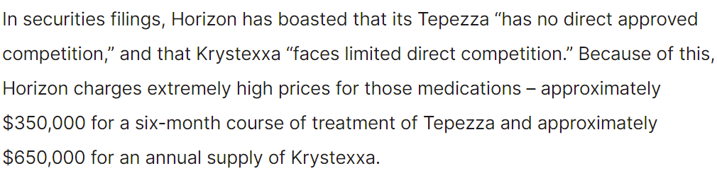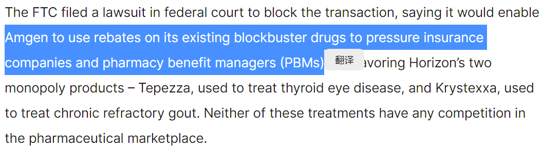 尽管安进、Horizon的产品没有什么重叠,但FTC认为安进可以利用已有重磅药物的返点来对保险公司和PBM施压,促进Tepezza和Krystexxa的销售。