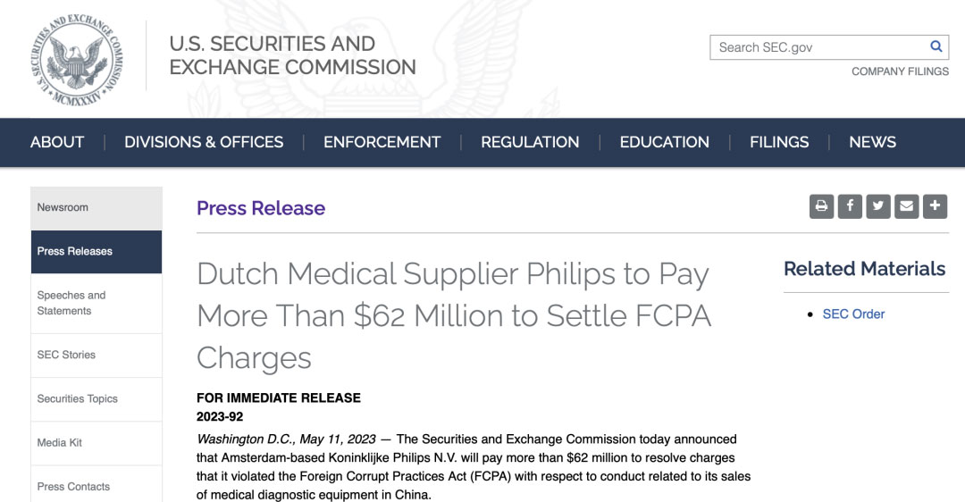 近日,美国证券交易委员会(SEC)宣布,飞利浦公司将支付 6200 万美元,以解决该公司的医疗诊断设备产品在中国销售的行为违反《反海外腐败法》(FCPA)的指控。