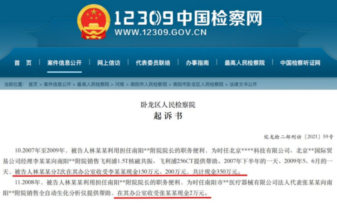 事实上,飞利浦等大型医疗器械公司在中国的“不当推广”行为,同样引起了国内监管部门的高度关注。2021年12月底,涉及河南南阳医专第一附属医院的一份起诉书被公布,原院长林文博因涉嫌受贿被批捕。
