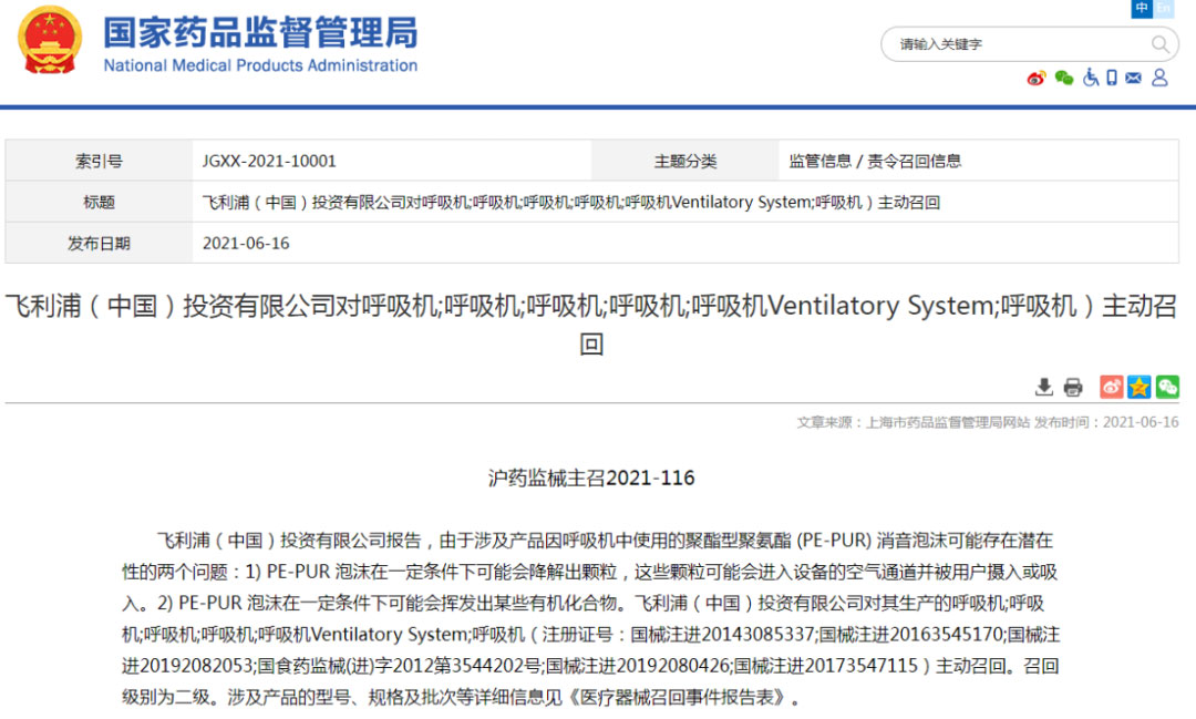 飞利浦呼吸机的召回,中国市场也在同步进行。2021年6月,国家药监局接连发布两则通知,宣布召回飞利浦旗下的无创呼吸机和x射线计算机体层摄影设备共计28494台,其中已在国内销售的呼吸机产品数量就高达28450台。主要召回原因同样是由于设备使用的泡沫材料有可能危害人体健康。