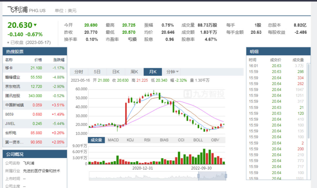 有业内人士指出,由于自2021年初以来飞利浦生产的某些呼吸机一直存在潜在的安全问题,召回事件频发,导致公司股价一路下跌,市值缩水。截至5月17日收盘,飞利浦股价下跌0.67%,至20.64美元,总市值为181.9亿美元。