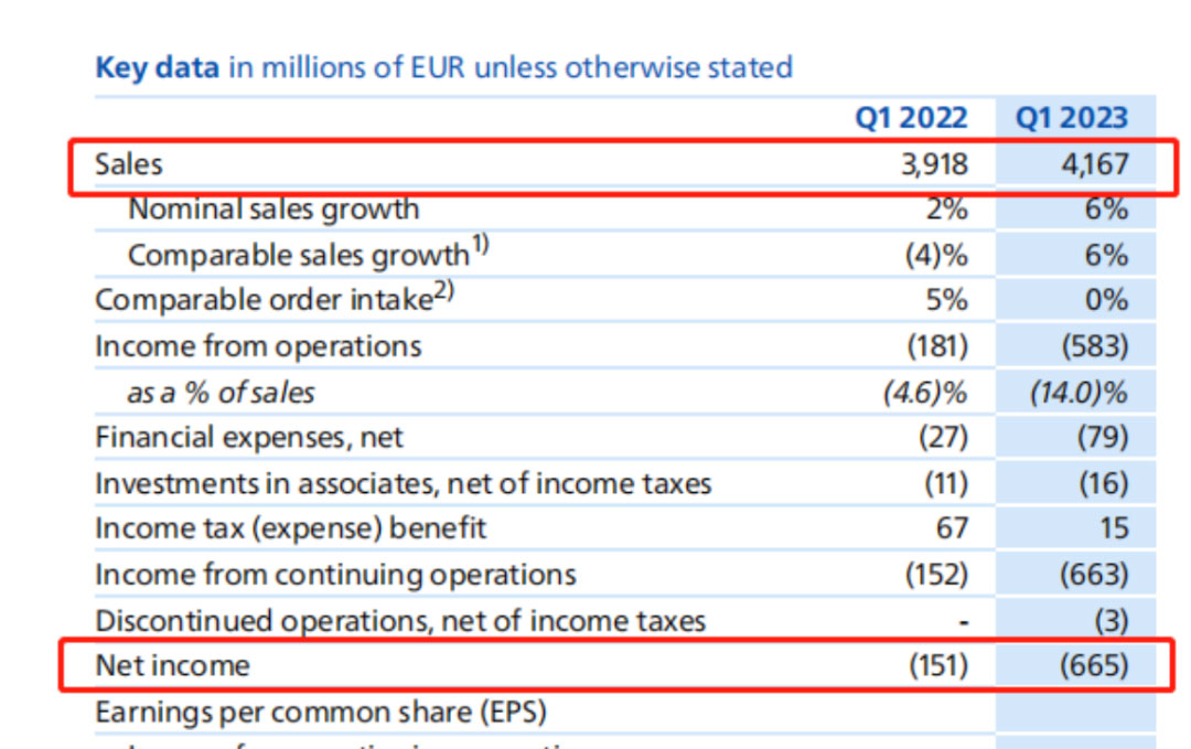 4月24日,飞利浦报告了第一季度财务业绩,其中销售额41.67亿欧元,同比增长6%,净亏损6.65亿欧元。除此之外,飞利浦报告经营亏损约5.83 亿欧元,主要原因是加速重组和应对诉讼进展的准备金。作为重组的一部分,飞利浦此前宣布计划裁员10000名员工。该公司表示目前的完成进度约54%。同时,飞利浦为产品召回的法律问题已计提了约5.75亿欧元的准备金。
