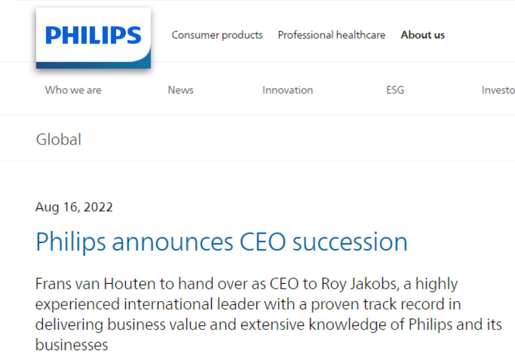2022年8月,飞利浦官方宣布,现任CEO万豪敦(Frans van Houten)在执掌公司11年后将卸任,其职位将由罗伊-雅各布斯(Roy Jakobs)接替,于2022年10月15日生效。
