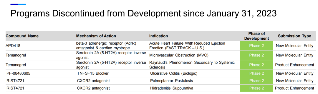 辉瑞一共终止了6条管线,其中5条为小分子药物,分别是:用于急性心力衰竭的APD418、用于血管阻塞的Temanogre、用于治疗雷诺氏综合征的Temanogrel、用于掌跖脓疱病和化脓性汗腺炎两种适应症的RIST4721。