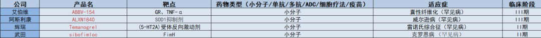 剩下的为阿斯利康用于NASH领域的合成多肽类药物cotadutide、罗氏用于骨髓纤维化的重组蛋白类药物zinpentraxin alfa、安进用于系统性红斑狼疮的双特异性抗体药物Rozibafusp alfa。