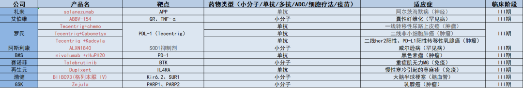 礼来终止用于阿尔兹海默症的solanezumab;辉瑞终止用于溃疡性结肠炎的PF-06480605;BMS终止用于黑色素瘤的nivolumab +rHuPH20;第一三共终止用于进行性骨化性纤维发育不良的DS-6016。