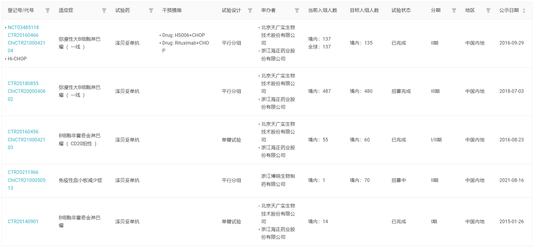 据 Insight 数据库,泽贝妥单抗共开展了 5 项临床试验,用于初治 CD20 阳性弥漫性大 B 淋巴瘤的 III 期临床于 2018 年启动,此外还在 2021 年 8 月针对自免领域的原发免疫性血小板减少症开展了 II 期临床。