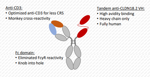 HBM7022 由和铂医药的免疫细胞衔接器平台 HBICE® 开发,采用二价高亲和力抗 CLDN18.2 和单价低亲和力抗 CD3 结构,在保证高杀伤活性的同时,降低了产生细胞因子风暴的风险,展现出良好的安全性、药代动力学特征和可开发性;同时改造了 Fc 端,有效延长半衰期,规避 Fc 交联和 ADCC 功能。