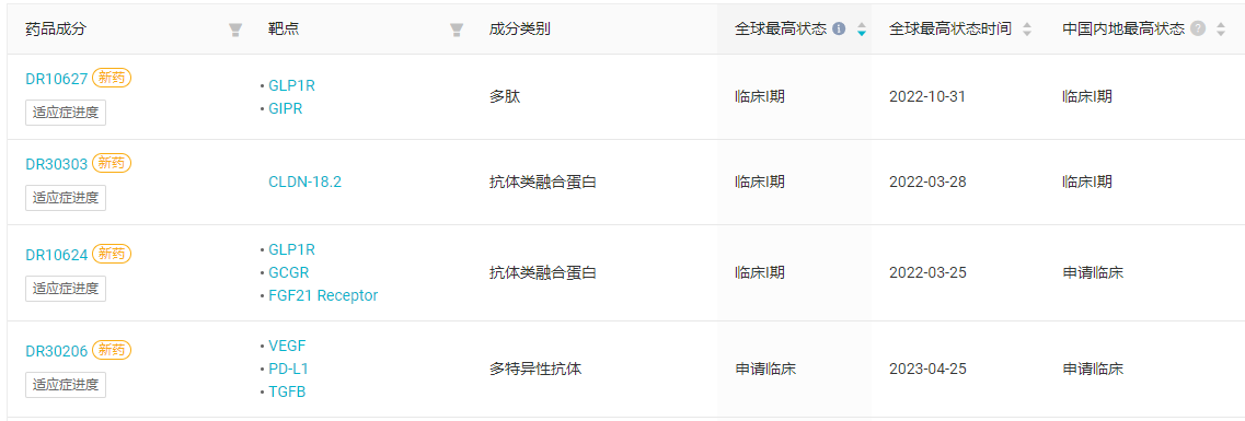 DR10624 为全球首创(first-in-class)的一种靶向 GLP-1 受体(GLP-1R)、GCG 受体(GCGR)和 FGFR1c/Klothoβ(FGF21R)的长效三靶点激动剂,拟用于治疗 2 型糖尿病、肥胖、代谢综合征等。这是同类药物中全球首款进入临床开发的品种。